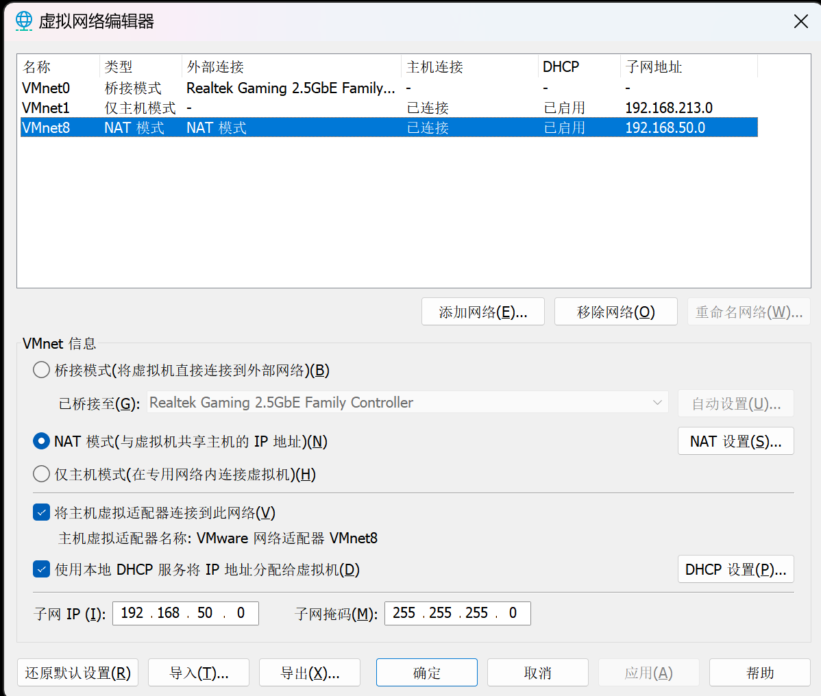 (1)根据镜像内情况分析为k8s集群,ip地址为192.168.50.x,将vm虚拟机的NAT网段调整至192.168.50.0